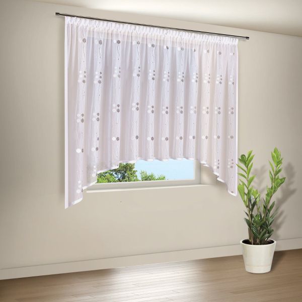 Die elegante C-Bogenform verleiht deinem Zuhause einen frischen Look und bringt neuen Wind an deine Fenster. Die Farbkombination aus transparenter weißer Grundware und farblich, in braun-weiß, abgehobener Stickerei laden direkt zum Wohlfühlen ein.