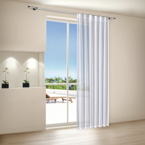 Der Dekoschal ist fertig genäht mit einem Stegband, mit dem dieser sowohl an einer Stange angebracht, als auch mit Gardinenhaken an einer Gardinenschiene befestigt werden kann.
