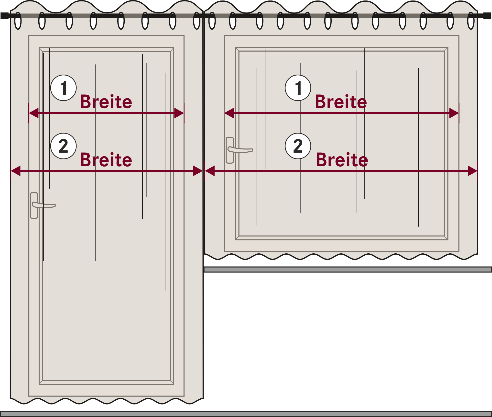 • Welche Breite soll die Gardine haben? Möchtest du, dass die Gardine lediglich das Fenster bedeckt (1) oder seitlich über die Fenster ragt und die komplette Stangebreite abdeckt (2) ?